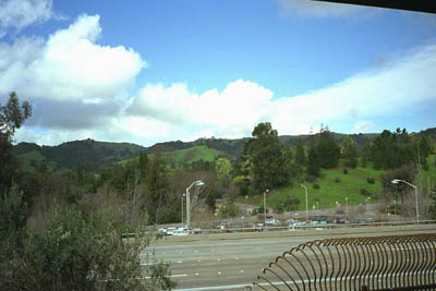 A picture with Zac on the left and Gia and Alisson on the right. And a view from the train station with the green hill around. |